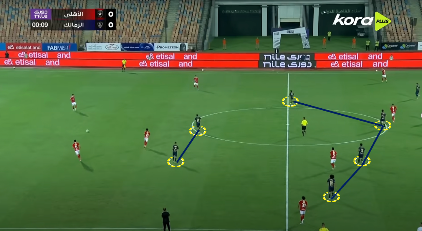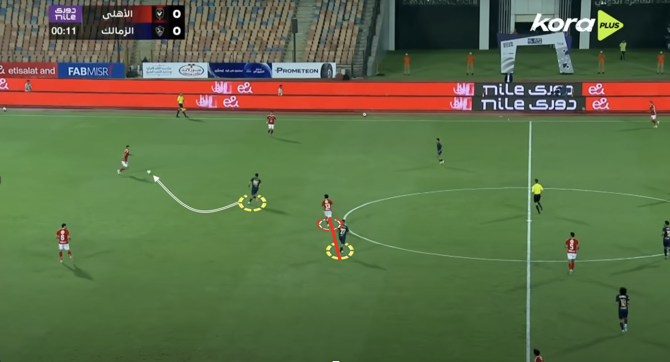 بدأ الزمالك بضغط بكتله متوسطه مائله للمنخفضه ب شكل ٤-٤-٢ ، تذهب الكره مداف اللاعب عدي الدباغ المشار له بالسهم الأبيض يتحرك بزاويه حتي يعزل الجبهه الأخرى ويذهب ناصر ماهر لمراقبه مروان عطيه وتكون مواجهه رجل لرجل علي الجبهه ، نجح الزمالك في هذا الضغط تقريباً في كل حالاته الي ان قرر الزمالك المبالغه في الرجوع و الدفاع من كتله منخفضه
