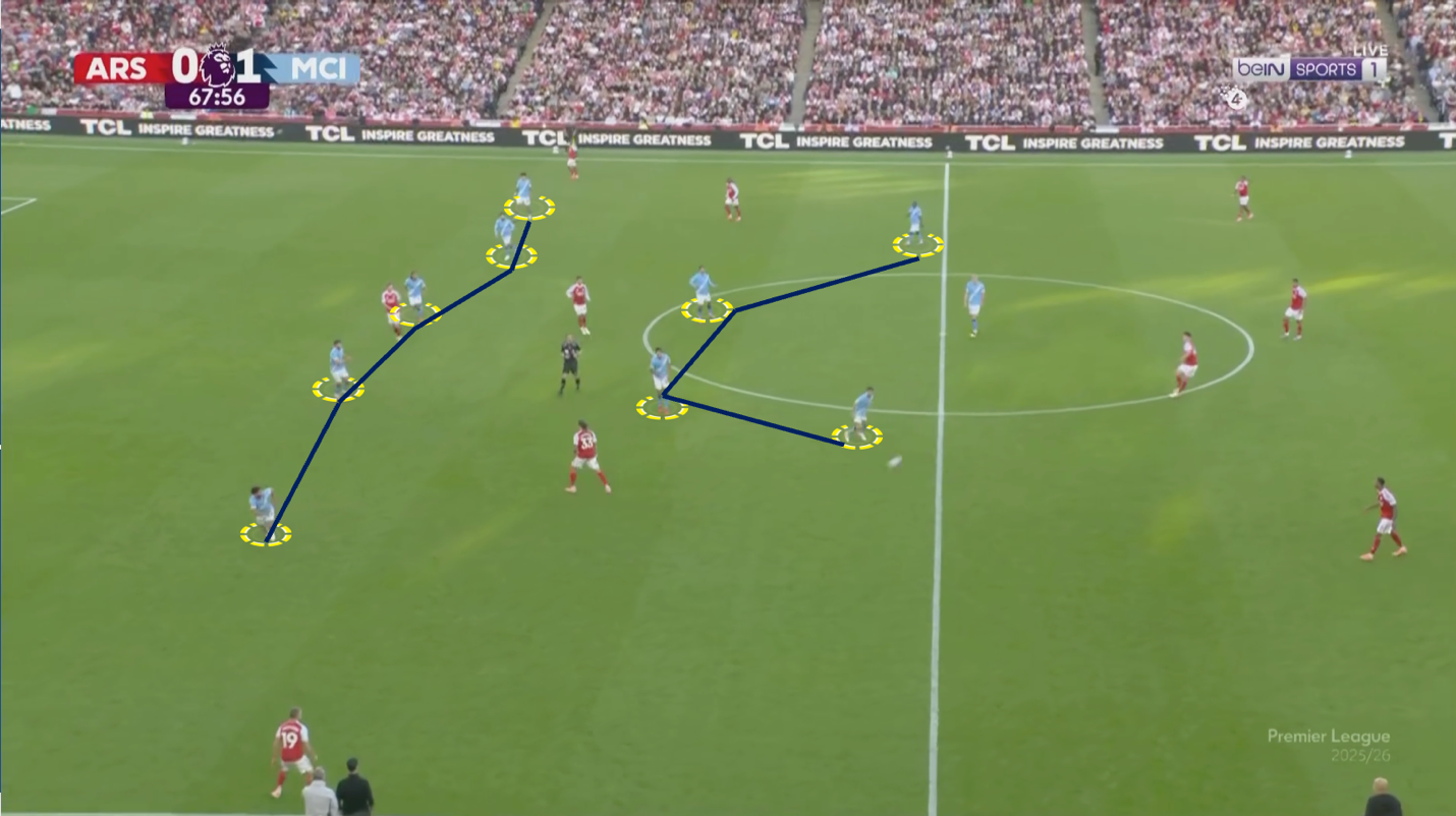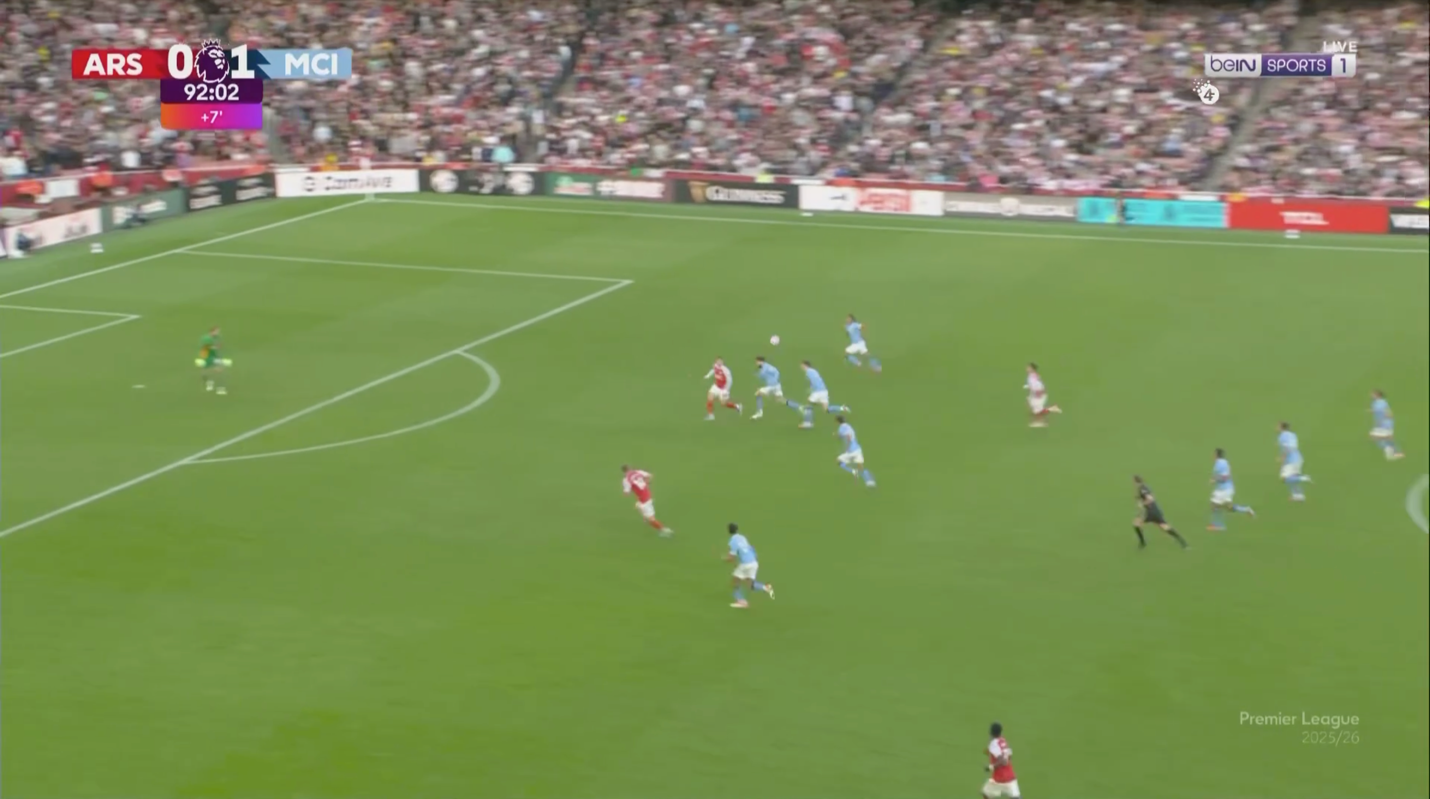 وهنا خسر السيتي كل شيء بعد ما كان يمتلك بناء اللعب بلعب الكرات الطويله علي هالاند وكان يمتلك بفوز هالاند في الصراعات الهوائيه كثيرا من الوقت الا ان فقد السيتي كل هذا بخروجه ، في إشارة إلى أن الأولوية باتت لتأمين المساحات الخلفية والبحث عن التحولات بدل الاستحواذ المتواصل. وهكذا تحوّل السيتي إلى شكل أقرب إلى خمسة-أربعة-واحد، تاركًا الاستحواذ لأرسنال ومفضّلًا التماسك والانتقال المباشر على حساب الهوية الكلاسيكية التي طالما عُرف بها .