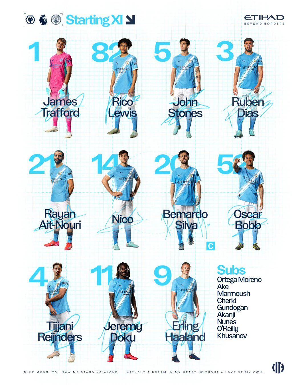 مانشستر سيتي بدأ في حراسة المرمى: جيمس ترافورد الذي عاد إلى سيتي بعد تجربة مع بيرنلي وآداء ممتاز . خط الدفاع: ريكو لويس، جون ستونز، روبن دياس، ورايان أيت-نوري (المدافع الجديد والقادم من وولفرهامبتون نفسه) . خط الوسط: تيجياني ريجندرز، نيكو غونزاليس، وبيرناردو سيلفا (القبطان) . الهجوم: أوسكاربوب، جيريمي دوكو، أمامهم إيرلينغ هالاند. البدلاء: على مقاعد الاحتياط تجمّع أسماء مثل ريان تشيركي، عمر مرموش، وماثيوس نونيز. وولفرهامبتون لعب بتشكيلة ضمت في المرمى خوسيه سا، وفي الدفاع توتي غوميز وإمامويل أغبادو ومات داهيرتي، وفي الوسط كي جانا هوفر وجواو غوميز وأندريه وديفيد وولف، بينما تواجد في الهجوم مارشال مونتسيتي وجان ريكْنر بيلّيجارد خلف المهاجم جورغن ستراند لارسن