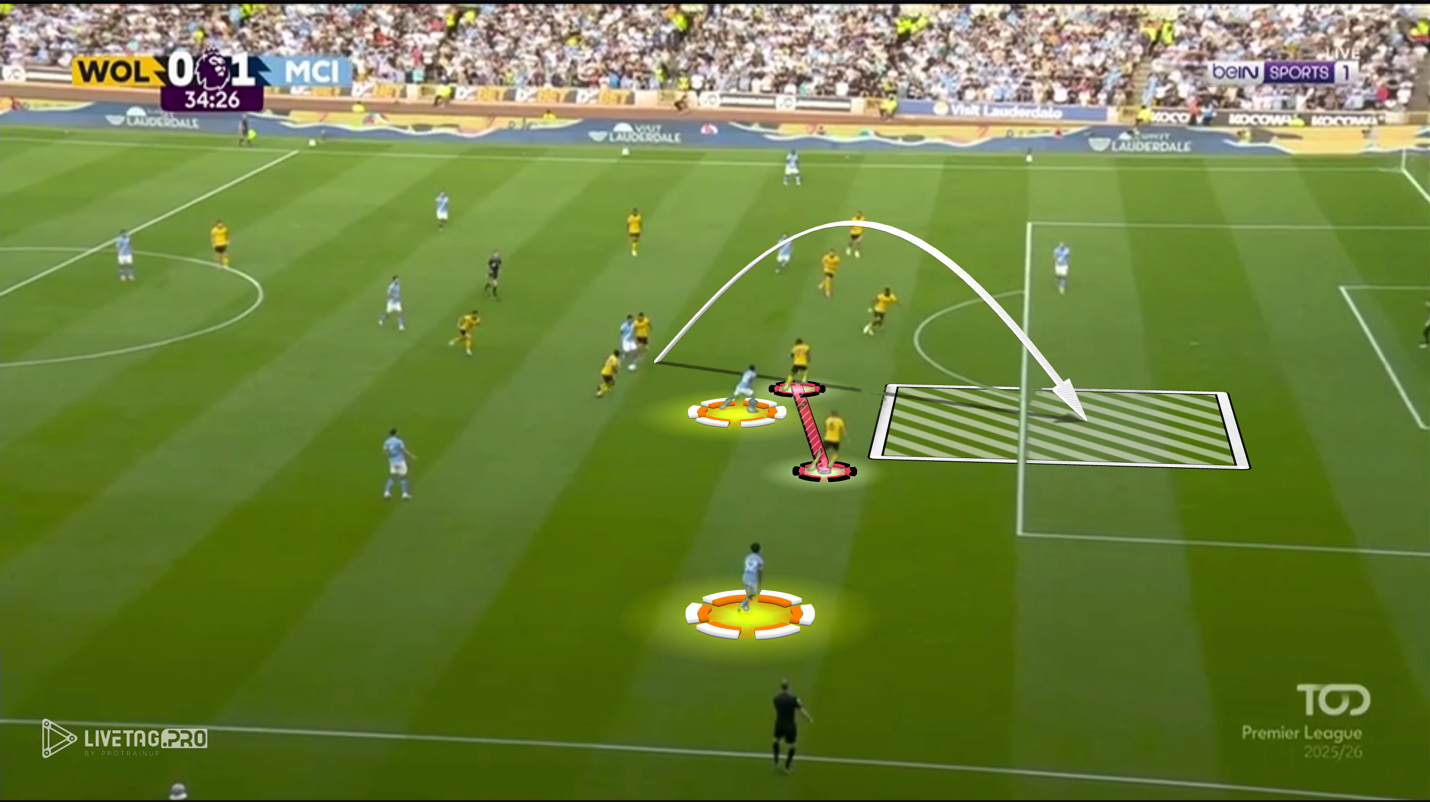 ونجد هنا أيضا هالاند يسقط للعمق لتوفير تمريره لزميله ولا خلاف ان هالاند قادر علي حمايه الكره بقوته البدنيه عندما يسقط للاستلام وظهره لمرمي الخصم ، ولكن هنا كان لها أيضا منفعه اخري الا وهي ، ان لاعب وسط الملعب في ولفز يوُضع امام خيارين اما ان يميل لريندرز او يميل لهالاند وهنا الثغره.