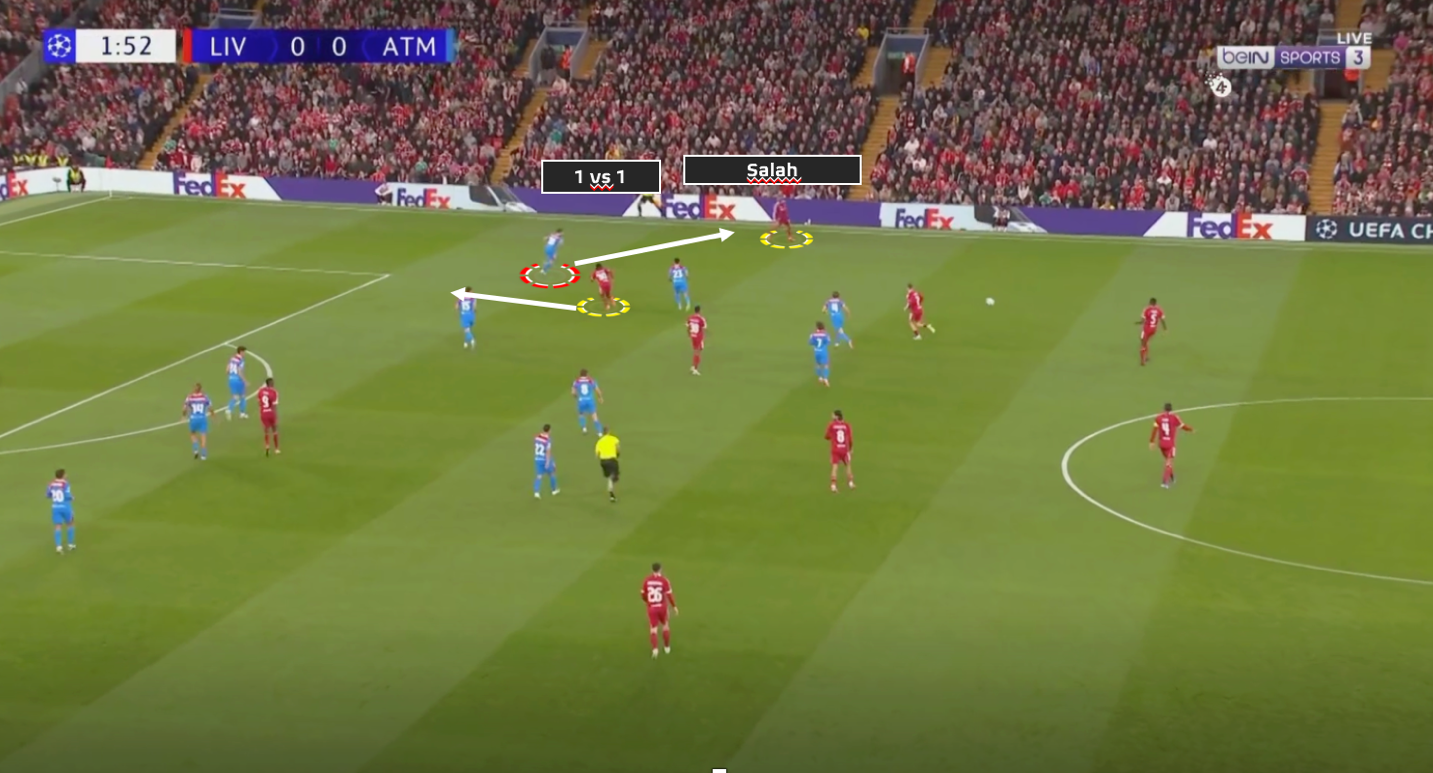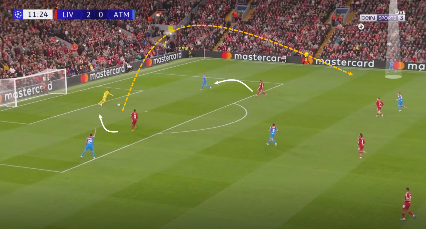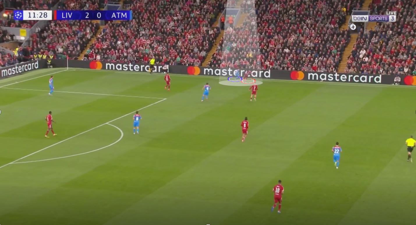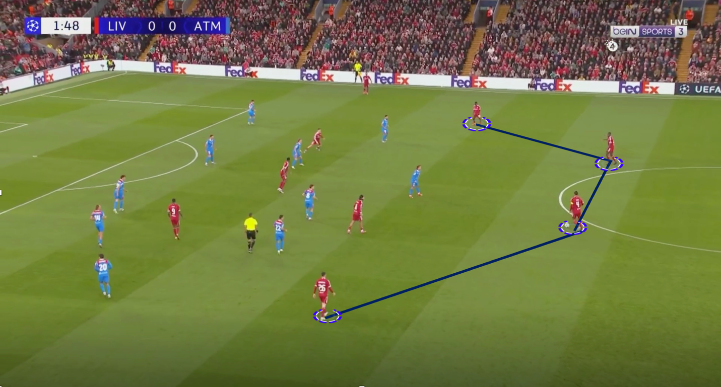 كان يضغط ليفربول بمحمد صلاح و ايزاك علي قلبين دفاع بزاويه تعزل خيار التمرير للظهيرين في فريق اتليتكو مدريد ، ويضغط لاعبوا الوسط سبوزلاي و فيرتز علي لاعبي وسط اتليتكو ، وتكون اظهره ليفربول في كامل جاهزيه و تركيز علي ان لُعبت الكره الطويله من اوبلاك لظهير اتليتكو مدريد ينقض عليه ظهير ليفربول بالضغط ، نجحت هذه الطريقه في أحيان كثيره و لجأ اتليكوا مدريد للكرات الطويله والتي يقوم بهما اوبلاك الغير دقيق في ارسال الكرات الطويله