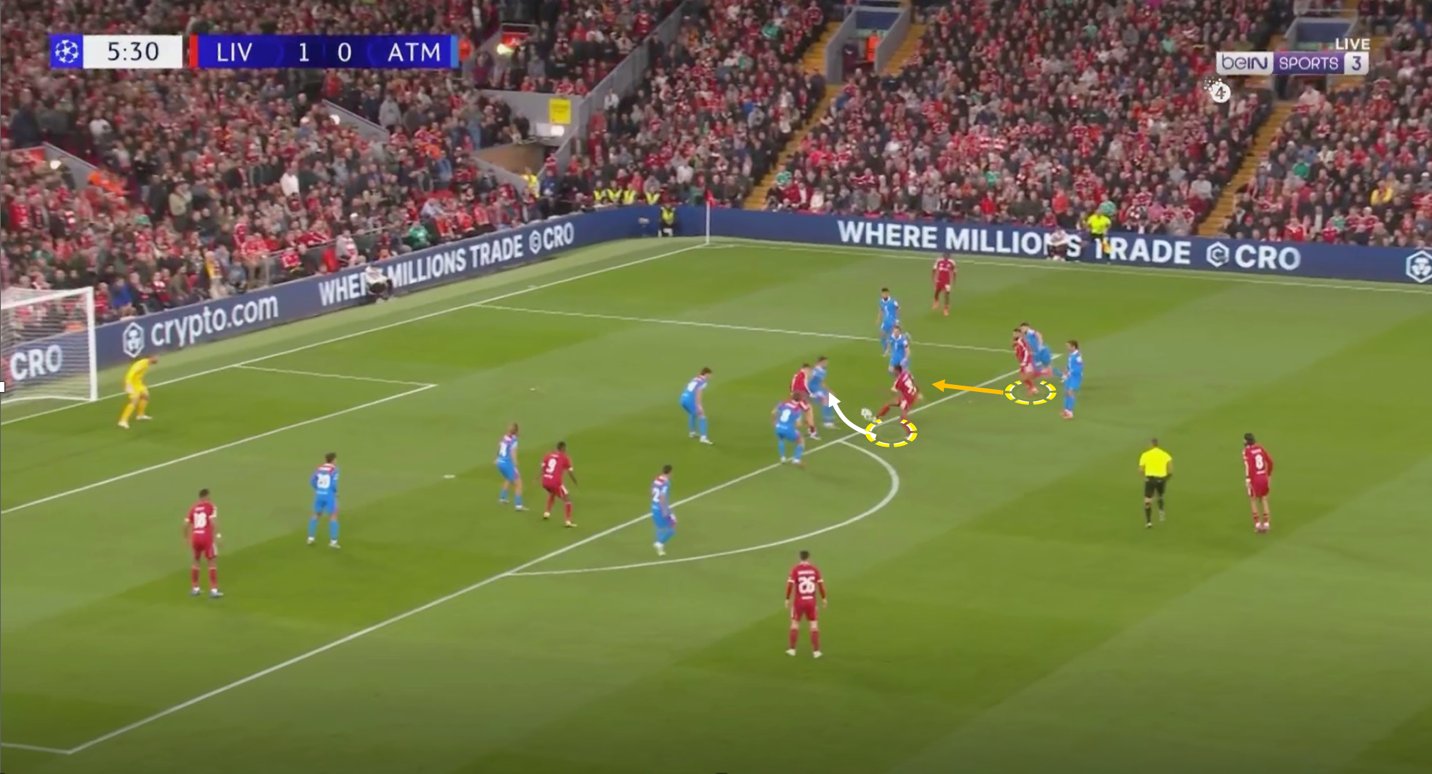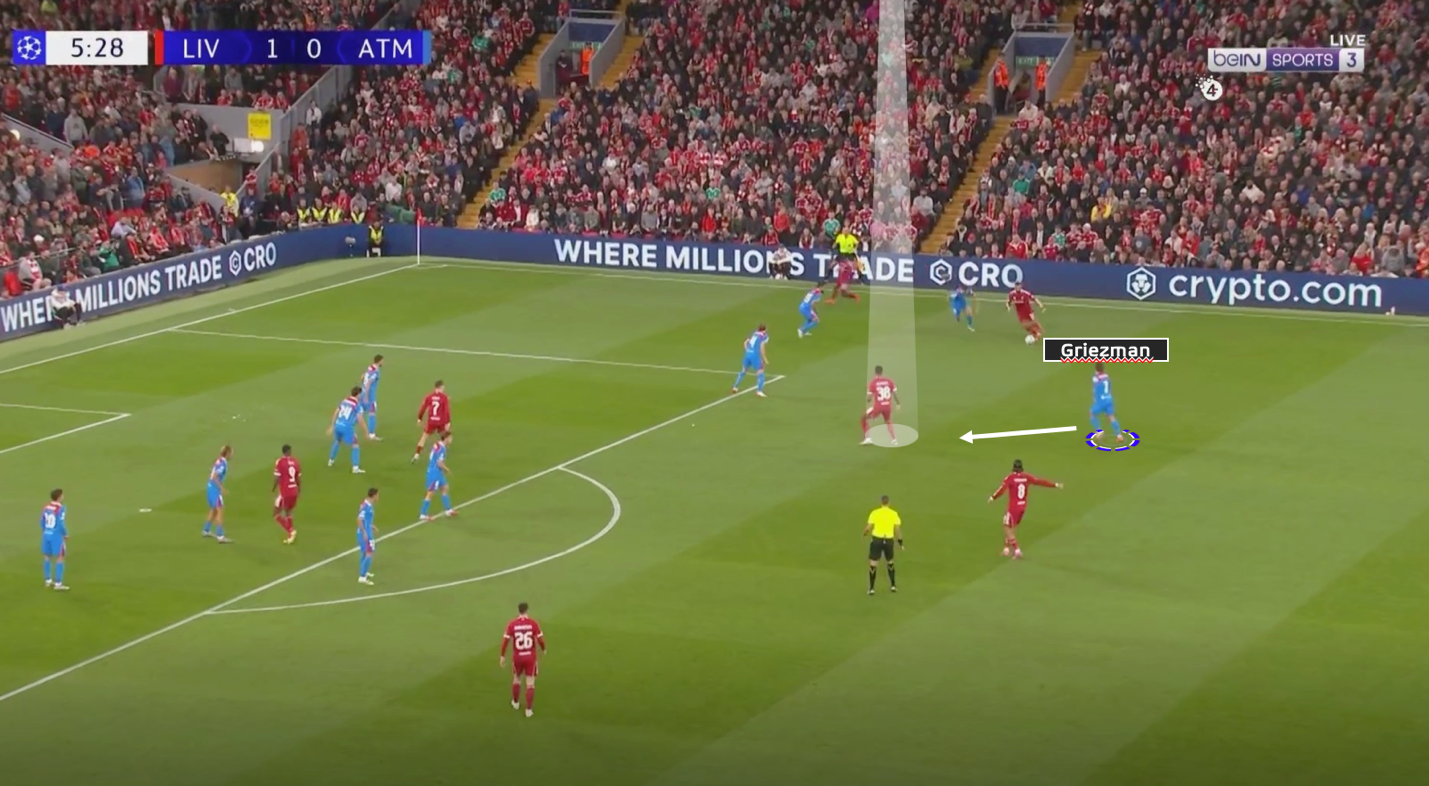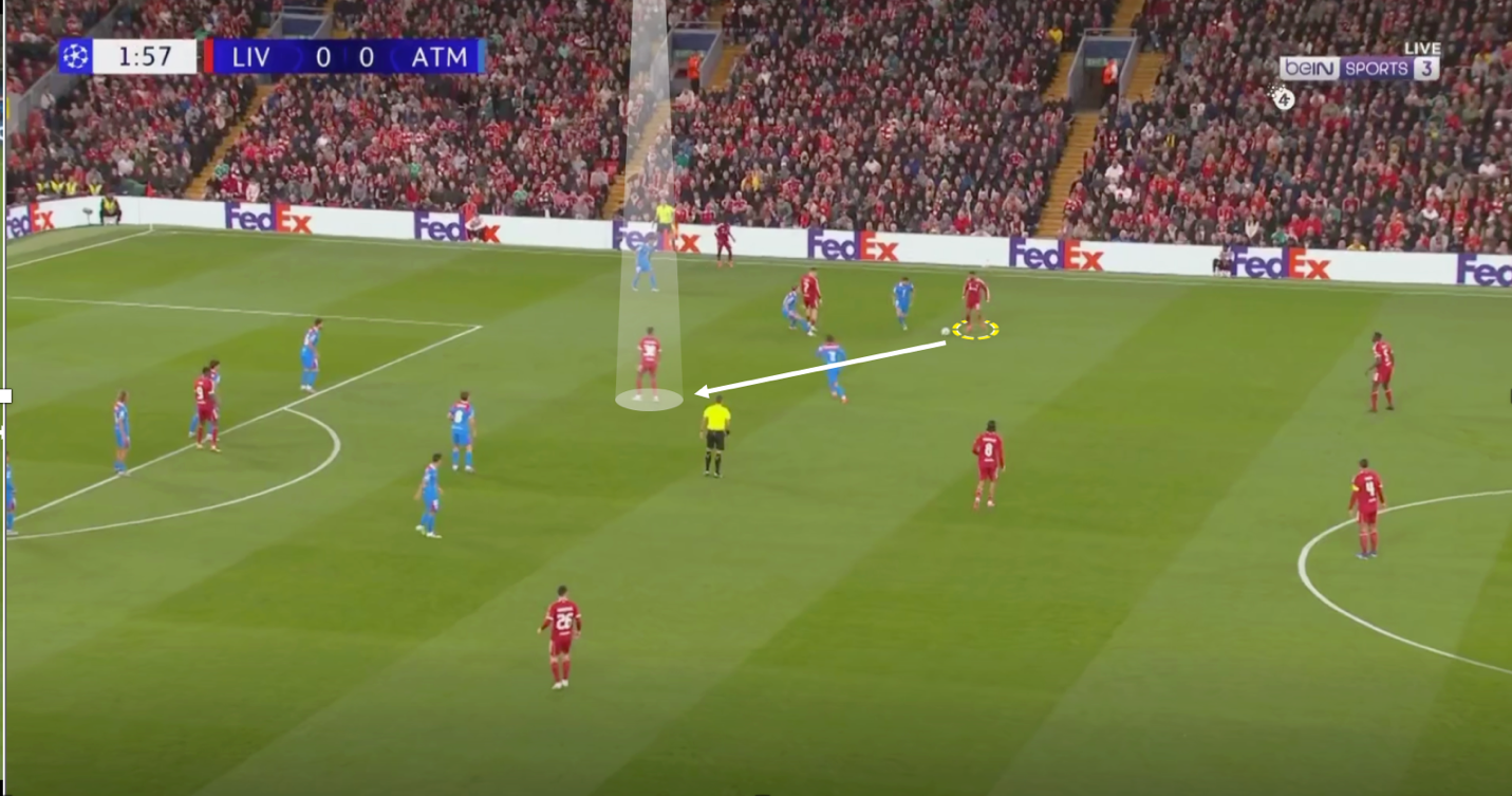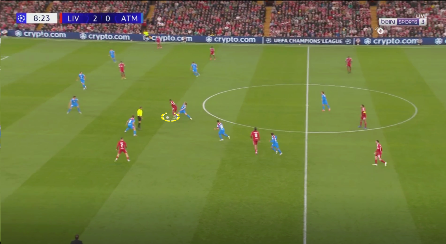 كان يضغط ليفربول بمحمد صلاح و ايزاك علي قلبين دفاع بزاويه تعزل خيار التمرير للظهيرين في فريق اتليتكو مدريد ، ويضغط لاعبوا الوسط سبوزلاي و فيرتز علي لاعبي وسط اتليتكو ، وتكون اظهره ليفربول في كامل جاهزيه و تركيز علي ان لُعبت الكره الطويله من اوبلاك لظهير اتليتكو مدريد ينقض عليه ظهير ليفربول بالضغط ، نجحت هذه الطريقه في أحيان كثيره و لجأ اتليكوا مدريد للكرات الطويله والتي يقوم بهما اوبلاك الغير دقيق في ارسال الكرات الطويله