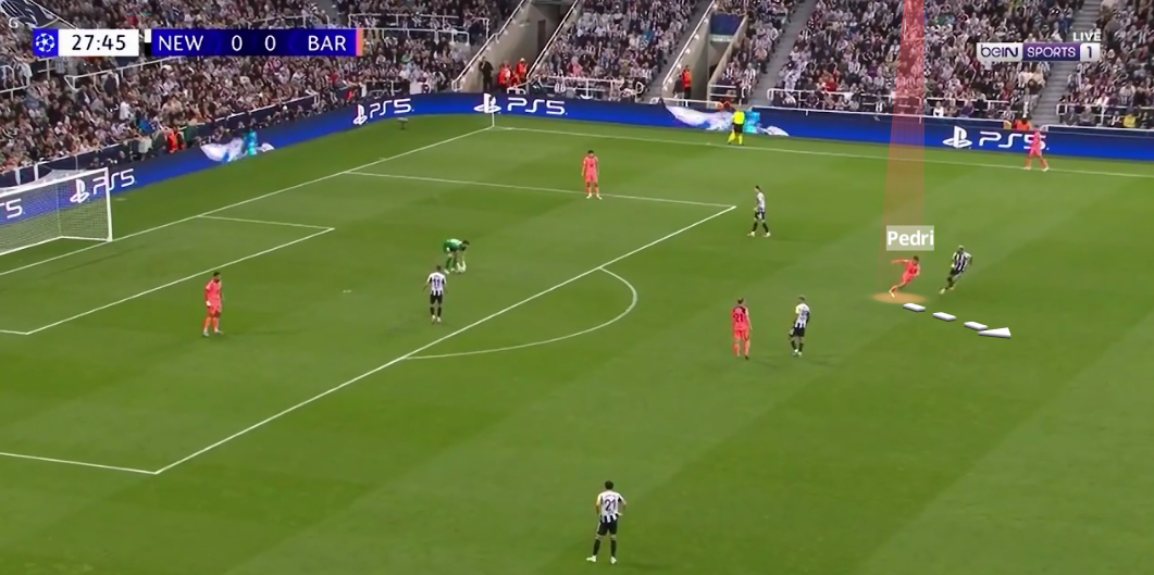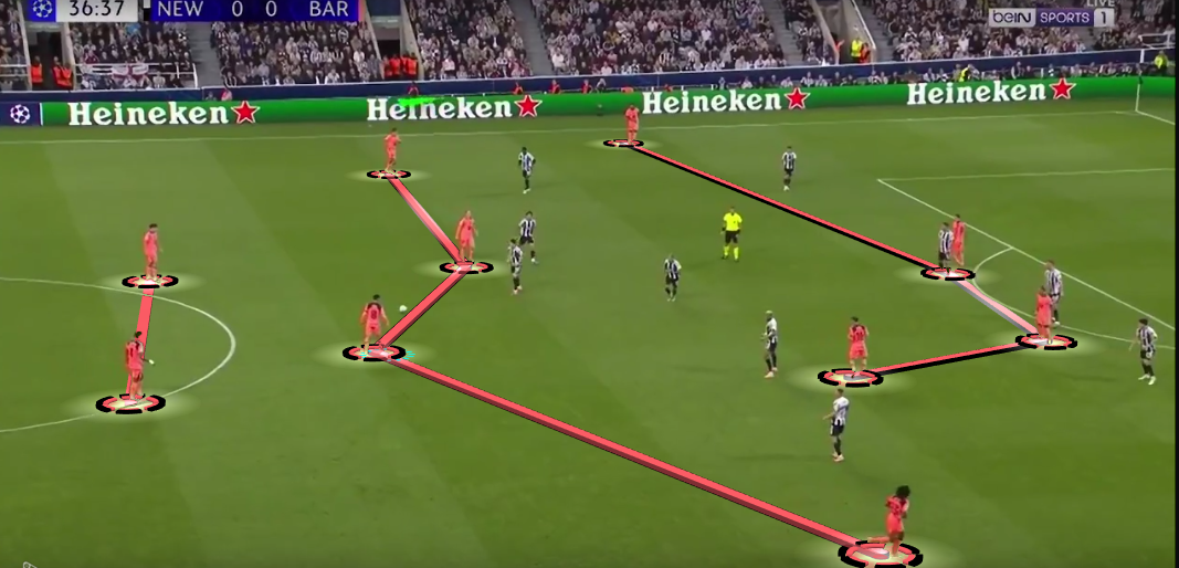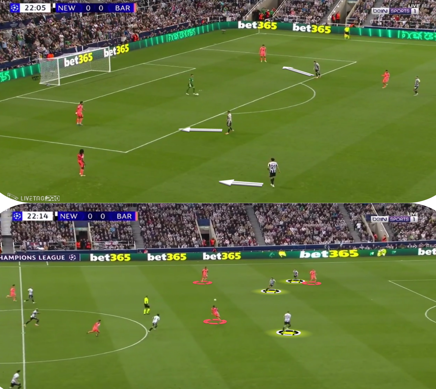 برشلونة عادةً لا يواجه صعوبات كبيرة أمام نظام الرقابة الفردية "المان-تو-مان"، بحكم امتلاكه هوية لعب ديناميكية تتيح له تجاوز الضغط من خلال التحركات المستمرة وتبادل المراكز. غير أن نيوكاسل أظهر شراسة بدنية وانضباطاً عالياً في الضغط، الأمر الذي أعاق برشلونة في عملية التدرج بالكرة عبر التمريرات القصيرة