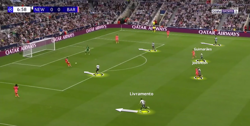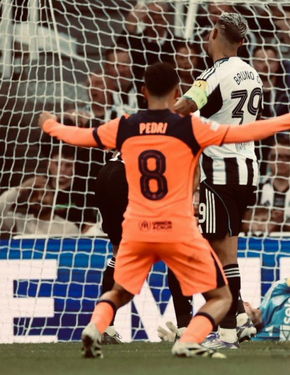 بدأ فريق نيوكاسل المواجهة بضغطٍ عالٍ منظم، قائم على نظام "مان تو مان"، حيث تولّى جويلينتون وجيماريش مراقبة دي يونغ وبيدري بشكل لصيق للحد من قدرتهما على البناء من العمق. في الوقت ذاته، تقدّم ليفرامينتو من الطرف للضغط المباشر على كوندي، بينما تحرّك بيرن إلى الجهة العريضة لإغلاق المساحات أمام رافينيا، في محاولة لعزل مفاتيح لعب برشلونة وتعطيل خياراته في التمرير القصير والخروج النظيف بالكرة على الأطراف، وهو ما جعل إيصال الكرات القصيرة إلى رافينيا وراشفورد مهمة شديدة الصعوبة