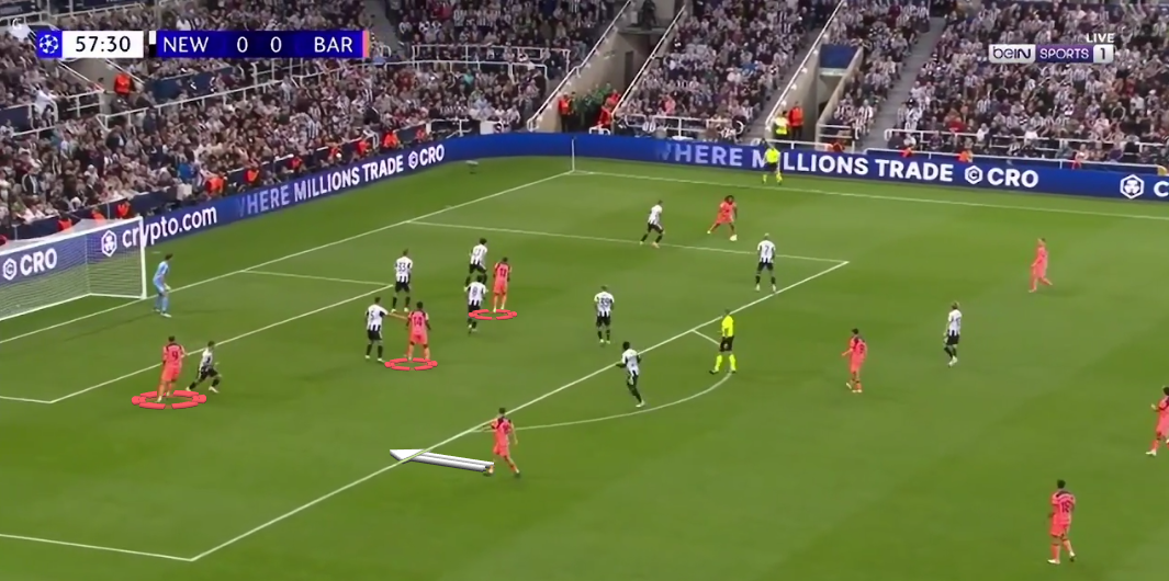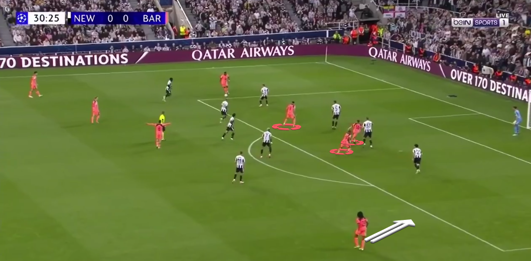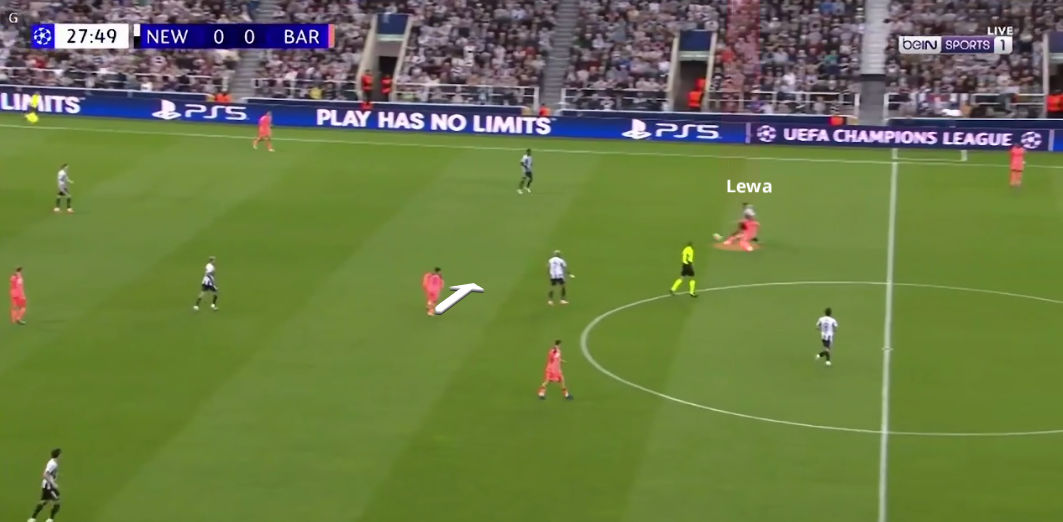 الحالة الأولى: نشاهد ضغط نيوكاسل العالي والشرس، مما يدفع غارسيا إلى إرسال كرة طويلة لليفاندوفسكي، ثم يلعبها الأخير في المساحة لرافينيا، ليُخلق موقف ثلاثة ضد ثلاثة، وتنطلق هجمة خطيرة