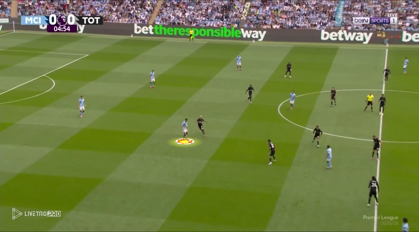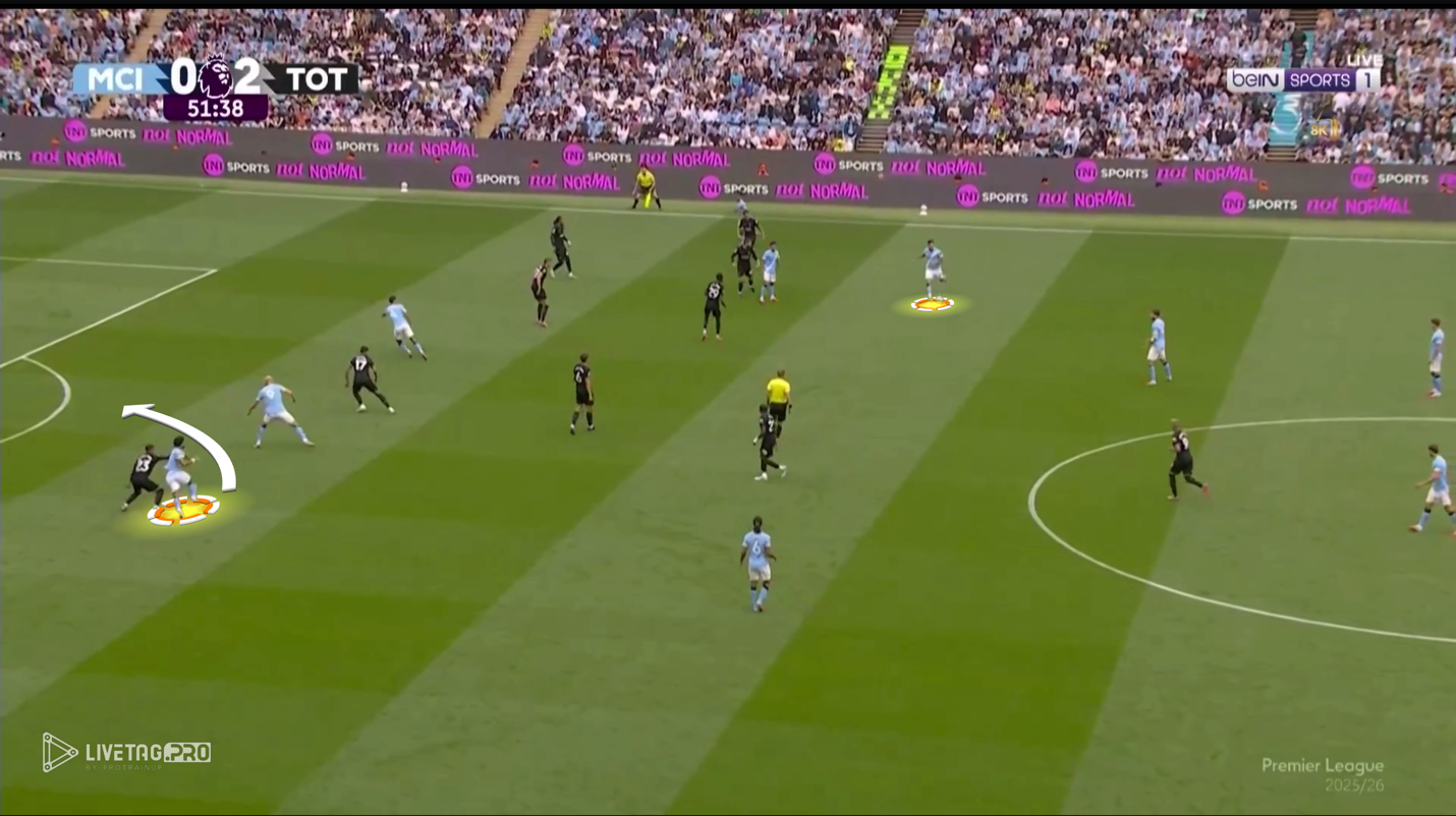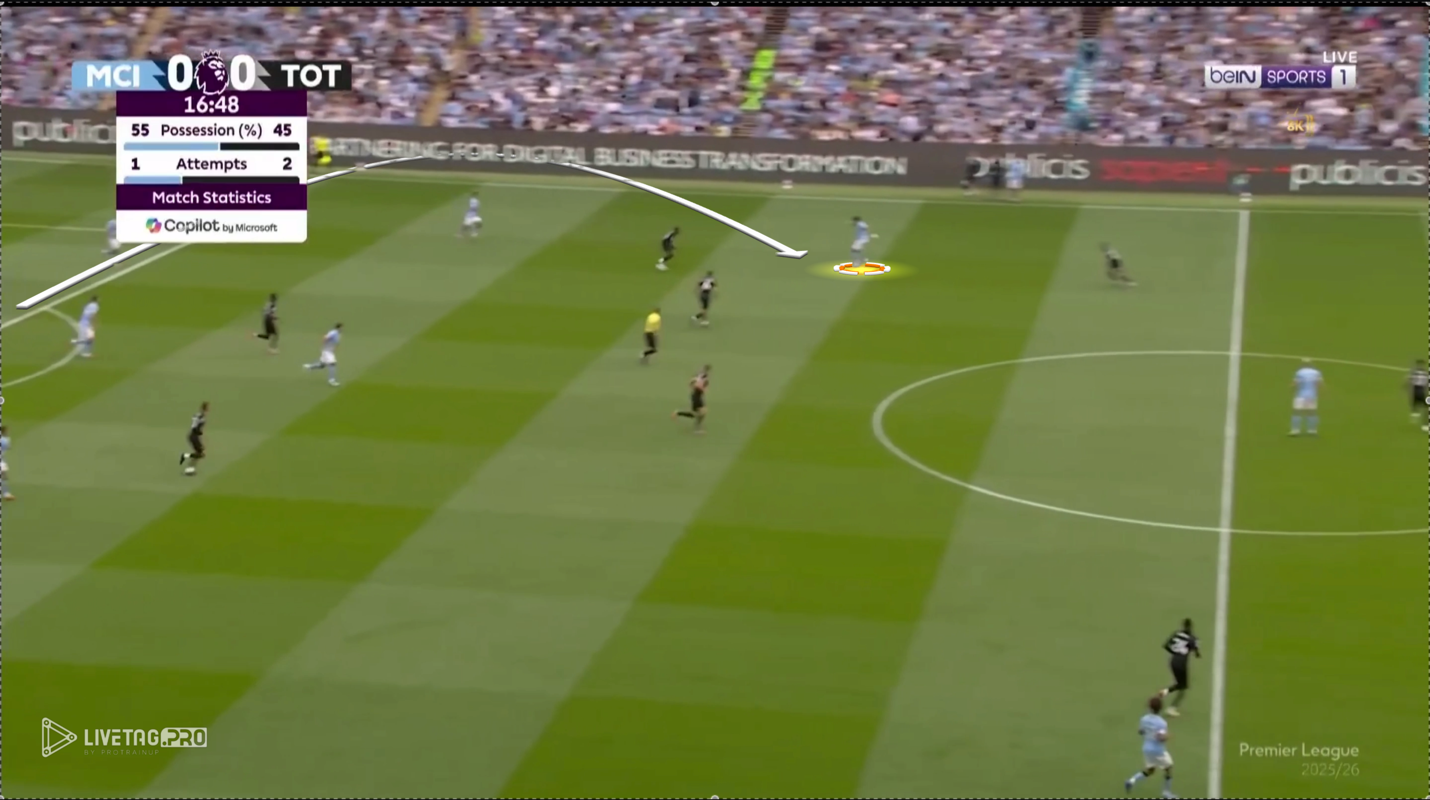 عند التحضير و البناد عند السيتي كان يجذب السيتي ضغط توتناهم بنزول خط وسط كاملاً مع وجود خط الدفاع كامل ليترك مساحات كبيره لعمر مرموش الذي يجيد الاختراق بسرعته و لكن الظهير الأيمن بدرو بورو و و ارتداد لاعبي توتنهام السريع احبط الامر