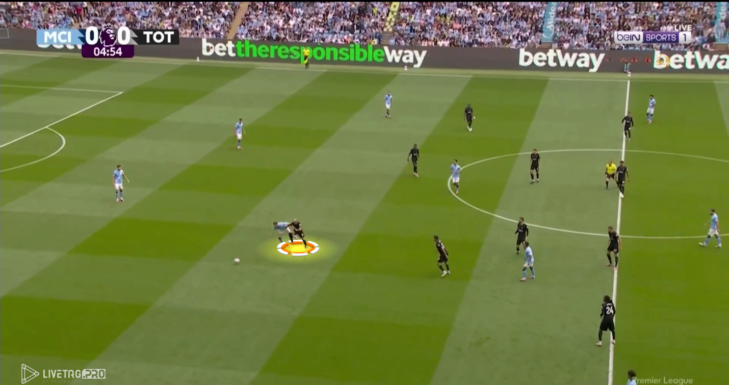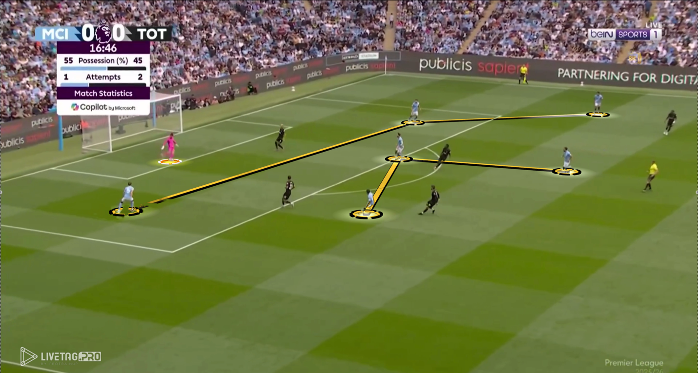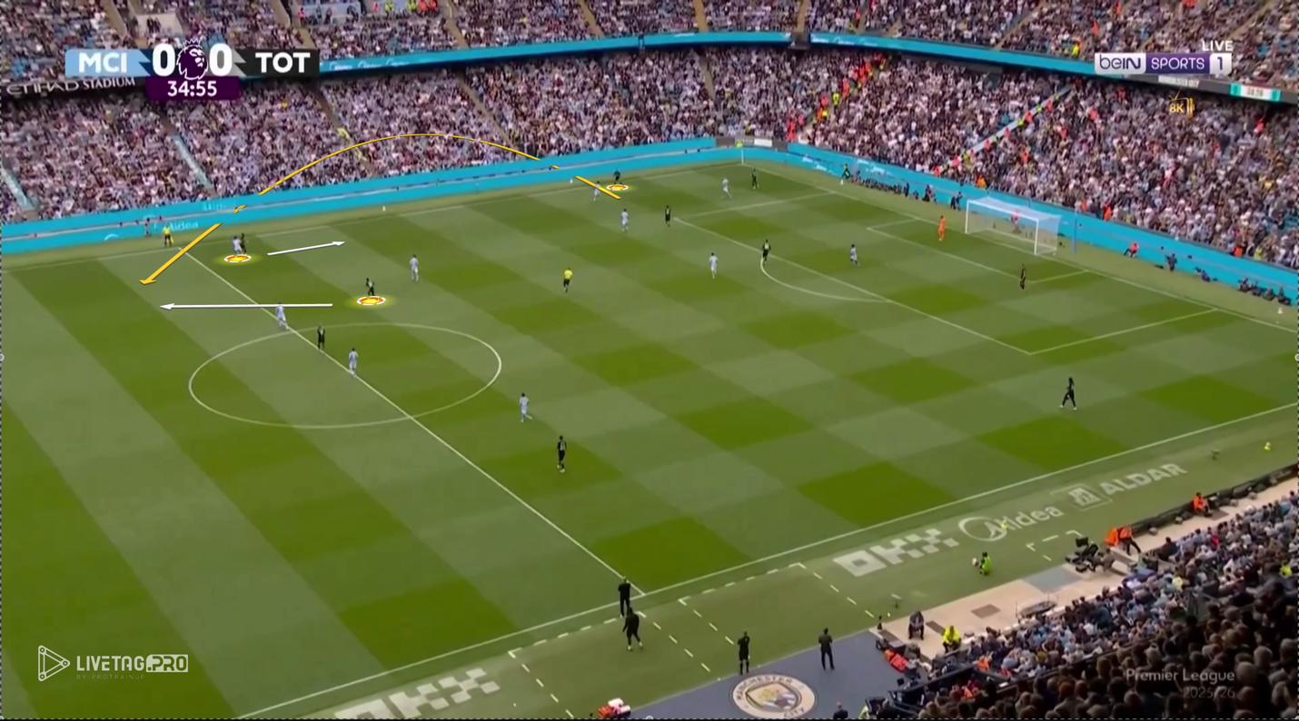 عند التحضير و البناد عند السيتي كان يجذب السيتي ضغط توتناهم بنزول خط وسط كاملاً مع وجود خط الدفاع كامل ليترك مساحات كبيره لعمر مرموش الذي يجيد الاختراق بسرعته و لكن الظهير الأيمن بدرو بورو و و ارتداد لاعبي توتنهام السريع احبط الامر