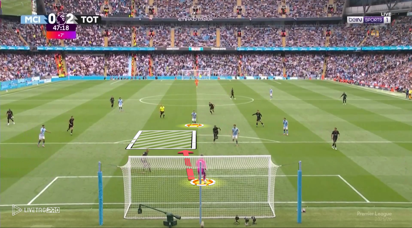 بينما يقوم جونزاليس بالمسح البصري للملعب وجد مساحه للاستلام شاغره للاعب ريان شرقي ، فقام بترك المساحه ليلعب الحارس له في هذه المساحه ولكن اخطأ الحارس ف بينما كانت فرصه محققه لهجمه خطيره للستيزن تحولت لهدف قاتل ، أيضا ذلك لا يمنع اللوم علي جونزاليس الذي يقوم بالاستلام بالرجل اليمني وكاشف زاويتها للاعب توتنها وخطأ أيضا من الحارس الذي يري من أي قدم يأتي منها الضغط ويلعب عندها.