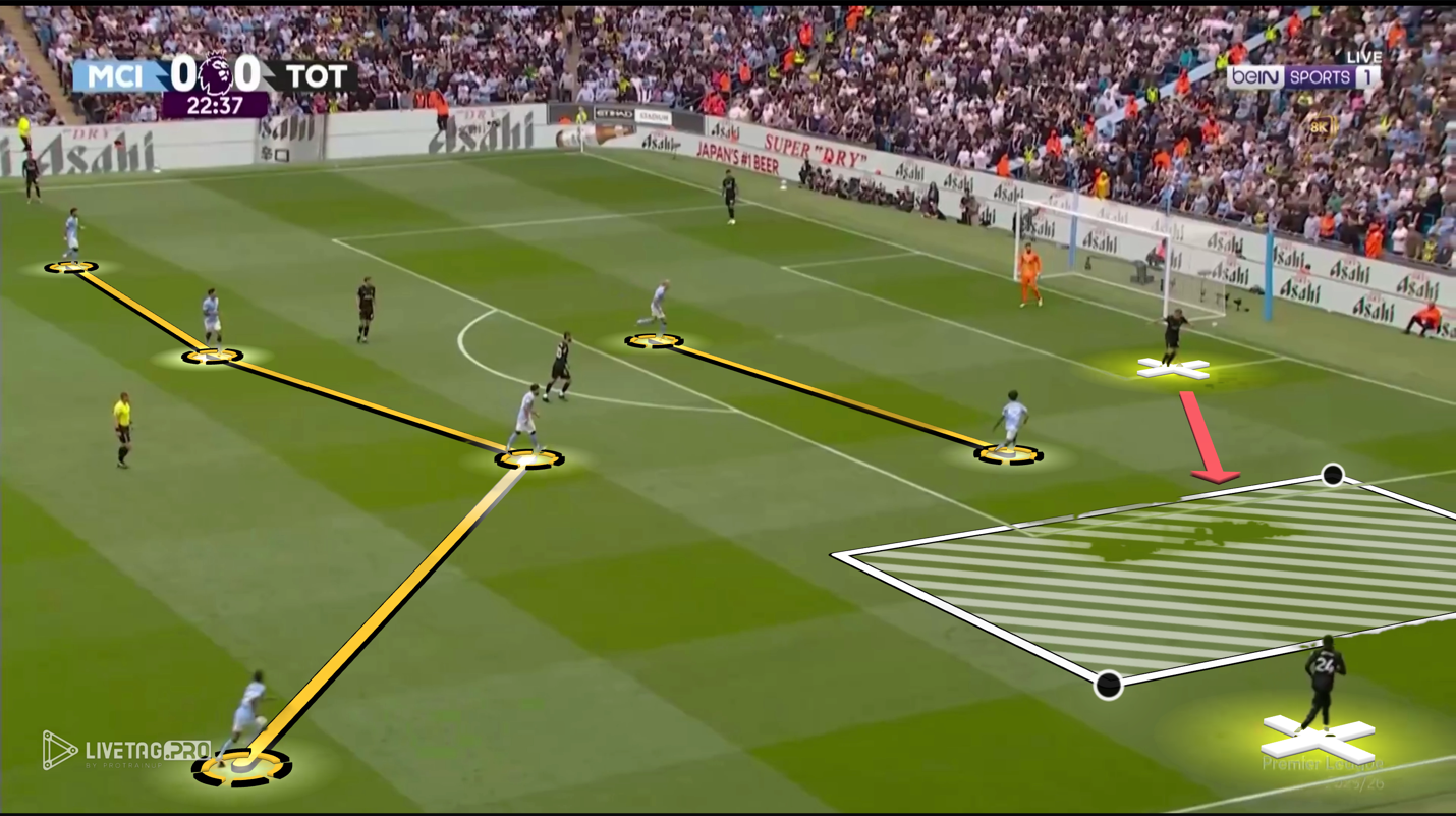كان السيتي يضغط في ضربه المرمي اذا ذهبت الكره للمدافع الايسر بشكل والايمن بشكل اخر ، ف هنا عندما تصل الكوره للمدافع الايسر يترك له اوسكار بوب مساحه للعب التمريره للظهير الايسر لتقليل الخطوره بالذهاب للأطراف و ان الظهير الايسر لتوتنهام لا يجيد اللعب تحت ضغط بشكل كبير ، ثم ينقض عليه ريكو لويس ويضعه في مأزق ، نجحت هذه الطريقه بشكل كبير ومتكرر.